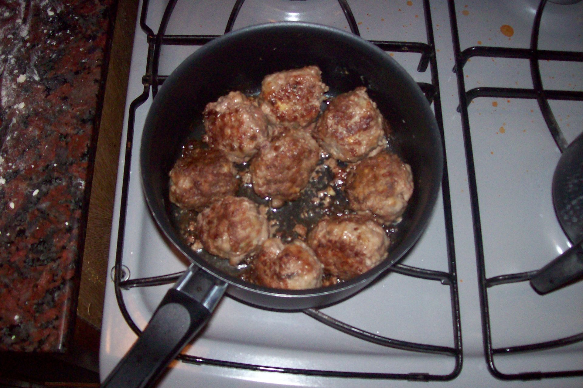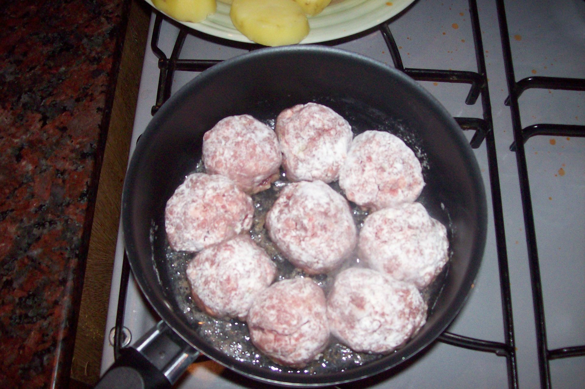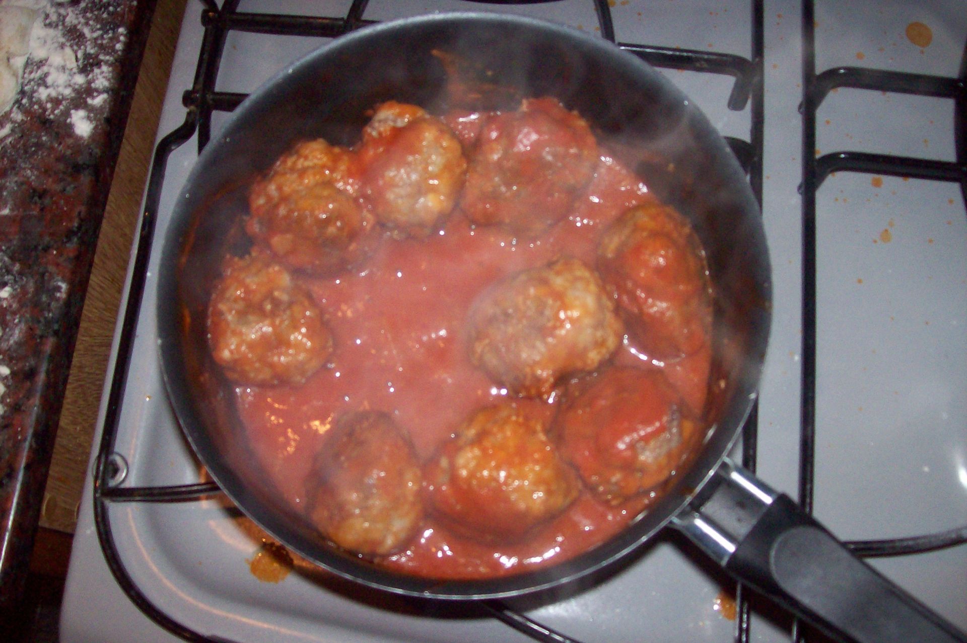 Bueno, como estamos parados: papas en el microondas secandose un poco, el tuco listo, y las albóndigas crudas, asi que ataquemos las albóndigas: poner en una sartén un poco de oliva y cuando hierva, agregar las albóndigas para que se sellen por toda su superficie, hay que ir girándolas. Una vez que estén todas selladas agregar tuco para que absorban el sabor y dejar hirviendo en el mismo. No poner todo ya que la otra parte del tuco la usamos para poner a los ñoquis.