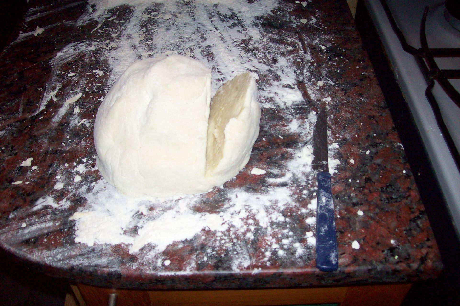 4- luego comencé a hacer la masa (tenía miedo que me quedara como un engrudo o una piedra), y descubrí que la CLAVE es ir agregando harina de a poquito, aunque uno se demore más, lo importante es que la masa esté a punto, porque es el punto clave de nuestra receta…. Así que comencé agregar de a poquito, mientras amasaba, hasta que al fin de cuentas terminé ocupando TODO EL KG DE HARINA, jajaja….. ni más ni menos..
