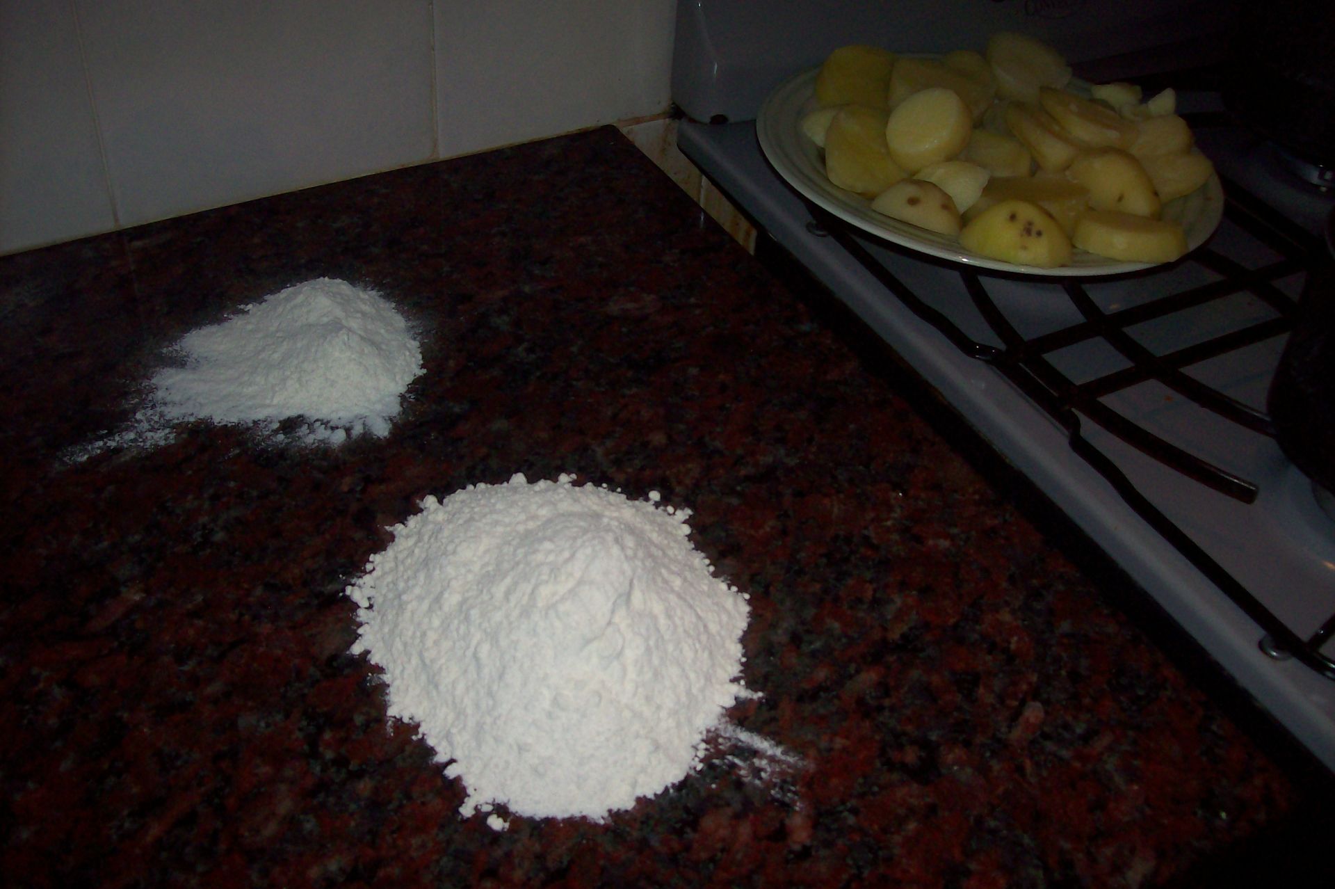Retirar las papas del microondas, ya deben haber perdido bastante agua, si no tenes microondas no te preocupes, tampoco es una ecuación matemática todo esto como para que salga perfecto.Hacer un montículo de 250gr. de harina, y otro de 100gr. Hacer puré con las papas (agregarle sal a gusto) y poner el puré en el montículo de harina mas grande. Amasar, amasar, amasar. A no desesperar cuando veas que la masa es cualquier cosa, ir agregando frecuentemente harina desde el montículo mas pequeño a la masa, generalmente cuando amasas se empieza a poner mas húmeda la masa y ahí hay que agregar harina.Repetir el proceso varias veces hasta llegar a una masa uniforme, que no sea pegajosa ni tampoco una piedra.Cortar la masa en varias partes con un cuchillo, y tomar cada una de las partes con las dos manos haciendo tiras largas del ancho de un dedo. Ir agreganfo harina en el proceso hasta que queden varias tiras con la masa.