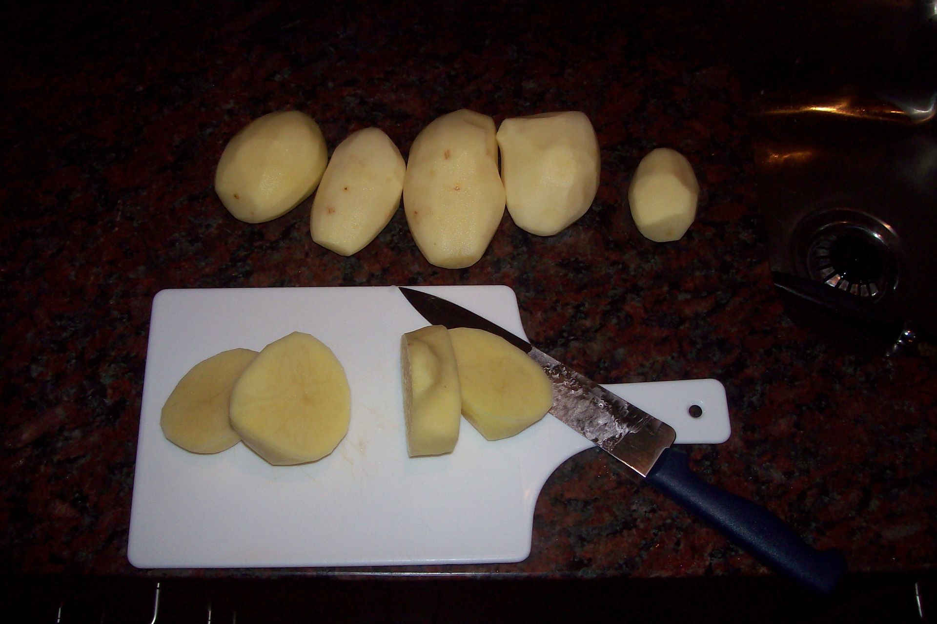 Primero largamos con el hervor de las papas, porque es algo que mientras se hace se aprovecha para realizar el tuco y las albóndigas en paralelo. Pelar las papas, y cortarlas en monedas pero de un tamaño bastante grande (ver foto), y luego ponerlas todas en agua a hervir.