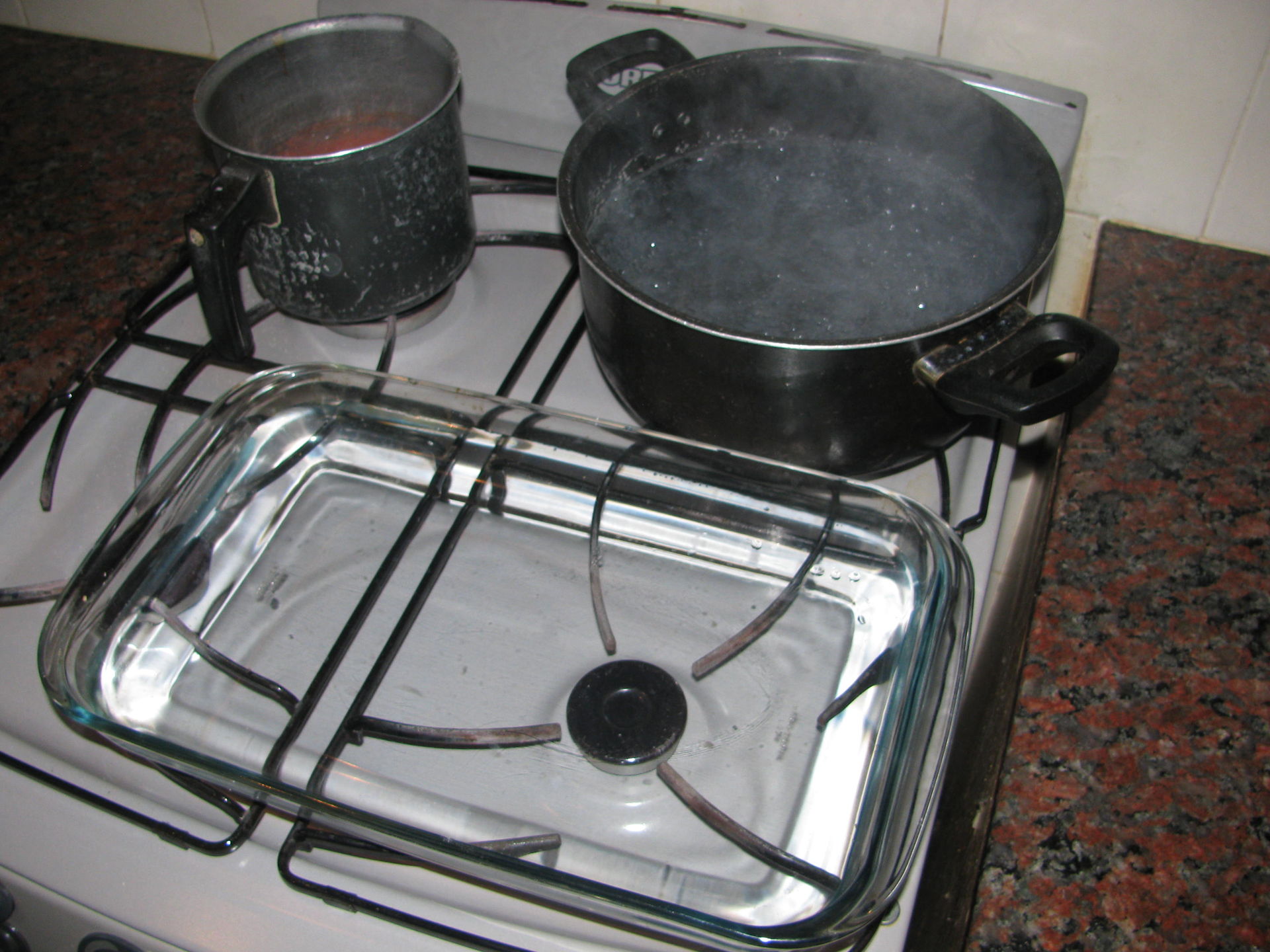 Hay que hacer con todos las partes de la masa unas finas capas e ir poniendolas una por una en un montículo (bien separadas por harina, sino se te pegan y ahí se pierde tiempo). Una vez que hiciste esto, hacé espacio, retira la pastalinda o el palo y pone a hervir agua en un recipiente no muy profunto, con 2 cm de agua estamos. Hay que cortar las partes de masa hachas como para que sean manejables, porque luego de ser amasadas pueden quedar de 50 cm x 10 y se complica para maniobrarlas. Ahora repetimos el siguiente proceso hasta llegar al tope de la lasagña:
