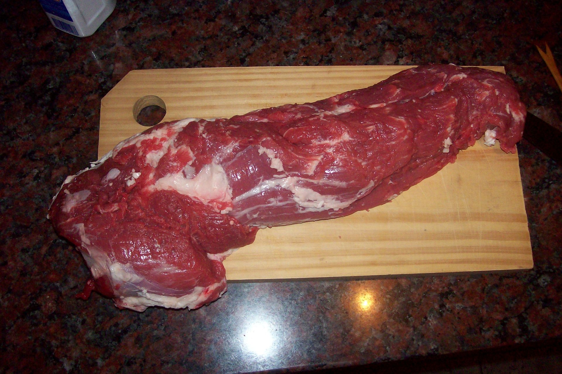 Que corte fiel que es el lomo, no recuerdo salvo una anécdota que me contó mi cuñado que éste corte salga alguna vez duro, es casi imposible. Si querés ir a lo seguro y que la carne quede bien, comprá lomo, pero sino tenes cortes buenos también como el bife de chorizo, peceto o una buena tira de vacío. Justamente ayer compré un lomo muy rico de 1.6 Kg. por lo que me atreví a cocinarlo al horno con un buen acompañamiento de papas rellenas con queso. En realidad no fué necesario utilizar todo el lomo porque somos 2 nada más ya que mi hija come con menos aderezos la carne, pero bueno hay que calcular como mínimo 600 Gg para dos personas si querés que te queden dos rodajas generosas.