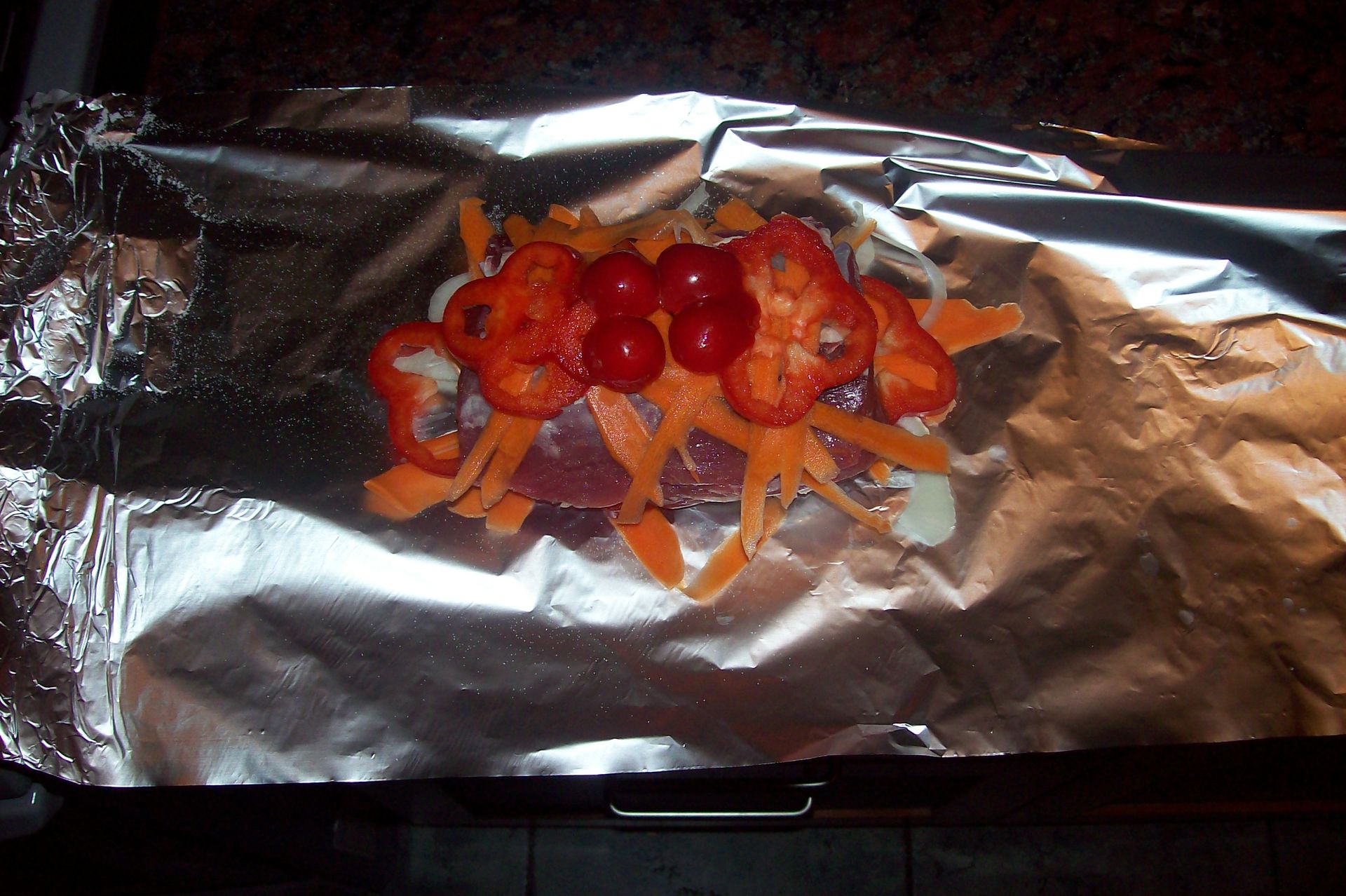 Poner el aluminio, sobre este la mitad de las verduras, luego el lomo (desgrasado y ya salado) y por encima uniformemente las verduras restantes y la manteca o margarina. Cerrar la cobertura del aluminio en forma de una U y luego bajar una punta y luego la otra. Poner al horno, temperatura de acuerdo a tu apuro, menos fuego mas tiempo por lo que yo pongo al maximo.