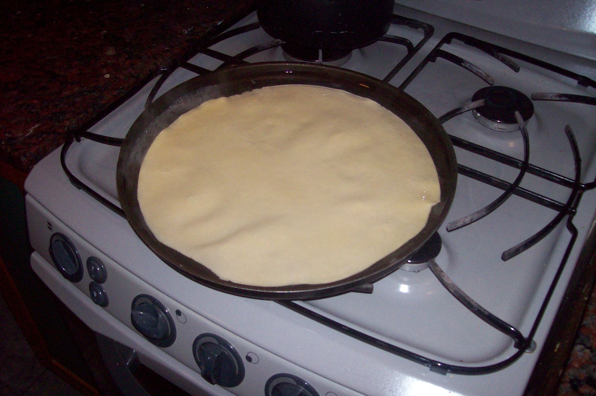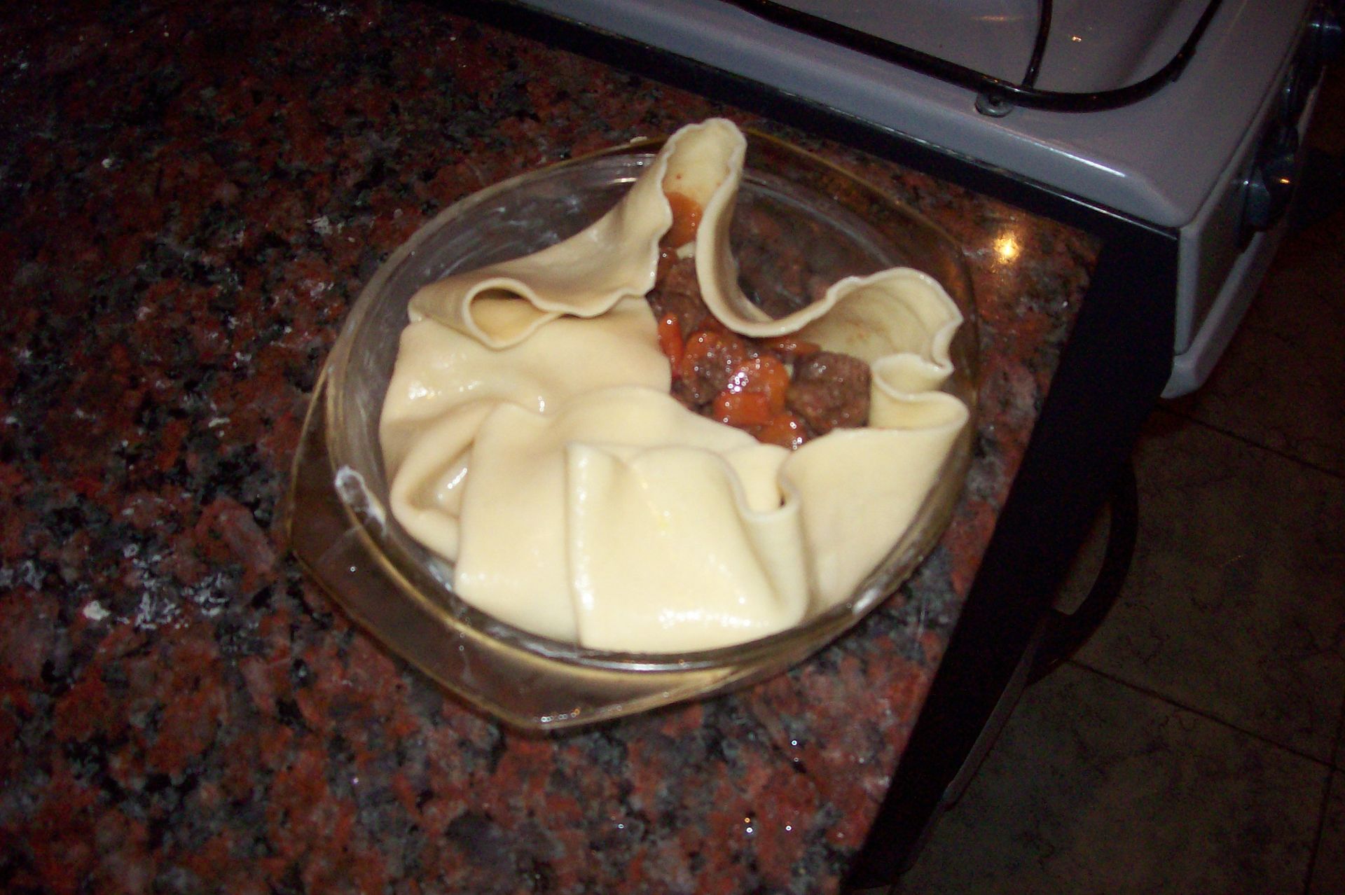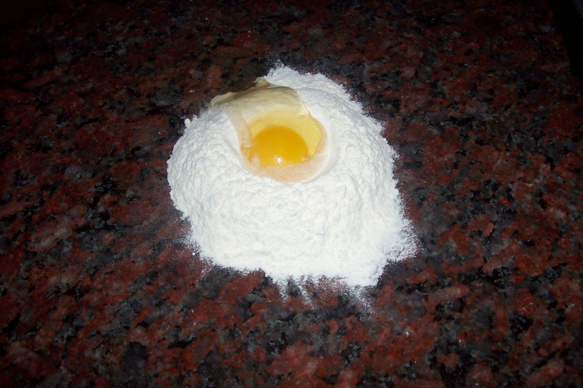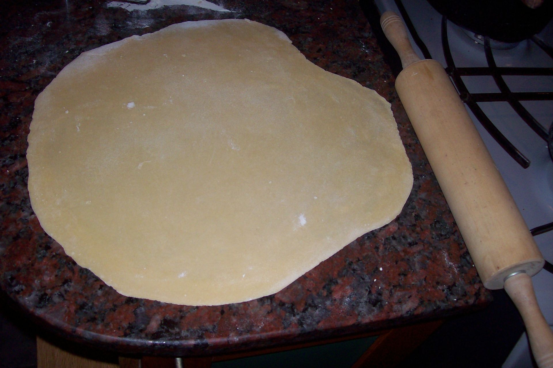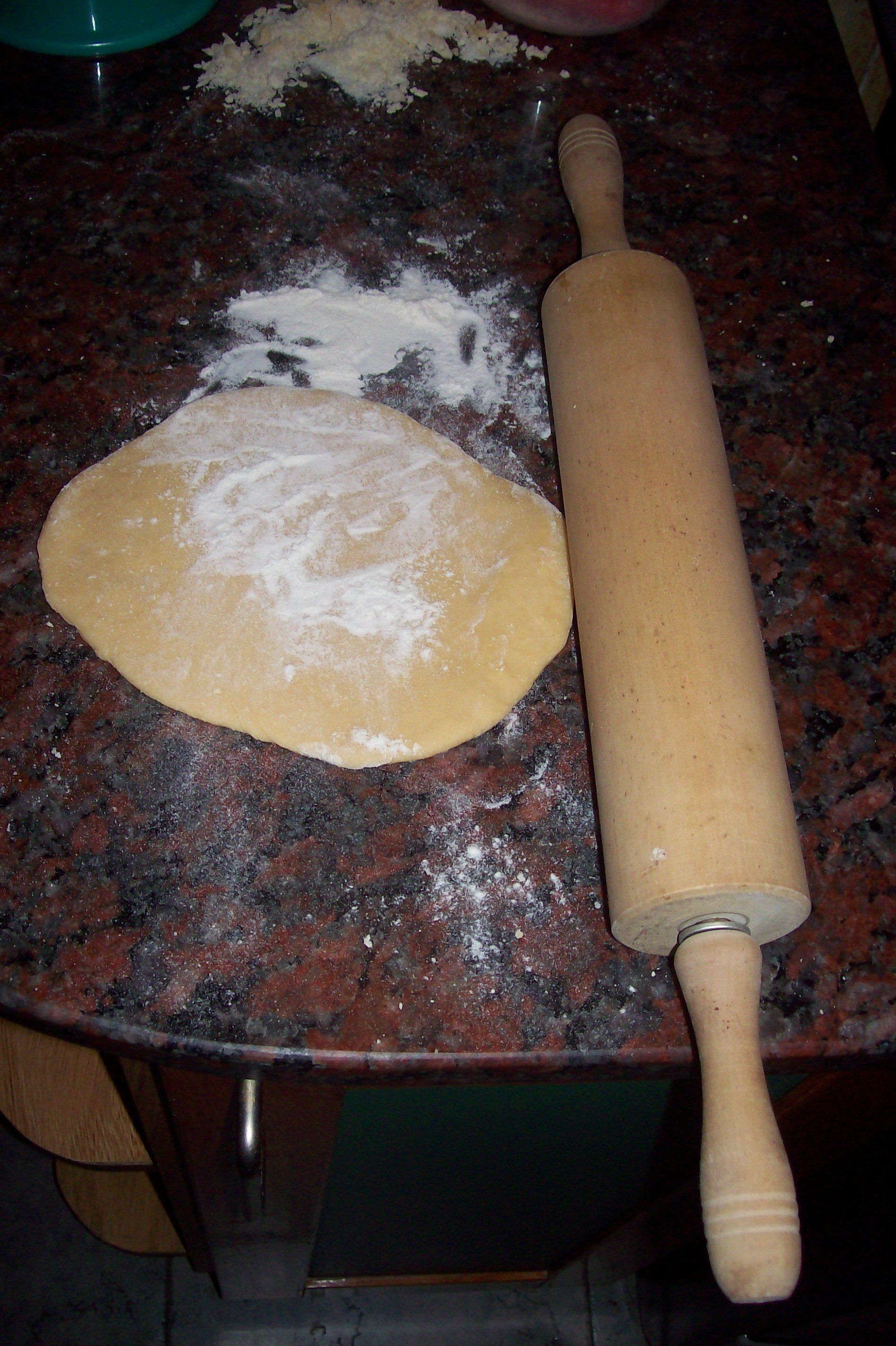 Mientras hierve el lomo, tomar 100 gr de harina, un huevo, una pizca de oliva y sal (misma preparación que los tallarines o la masa de la lasagña, dos recetas que ya expliqué acá) y hacer un bollo el cual posteriormente lo amasamos bien con un palo de amasar hasta que quede como una pascualina de forma (en realidad opté por esta forma porque el recipiente donde coloco luego todo es circular).