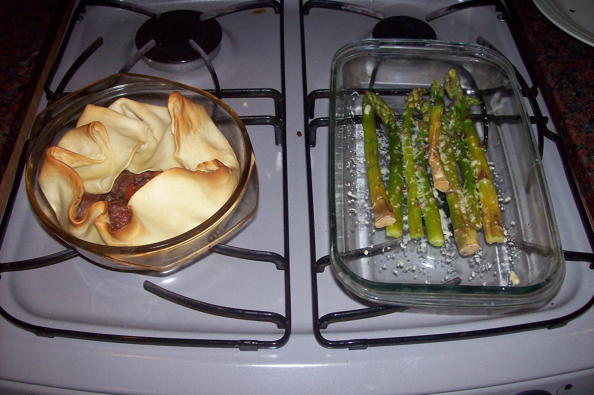 Nada mas, servir en un plato la porción de la cazuela junto con los espárragos y acompañar con un buen vino tinto Merlot.