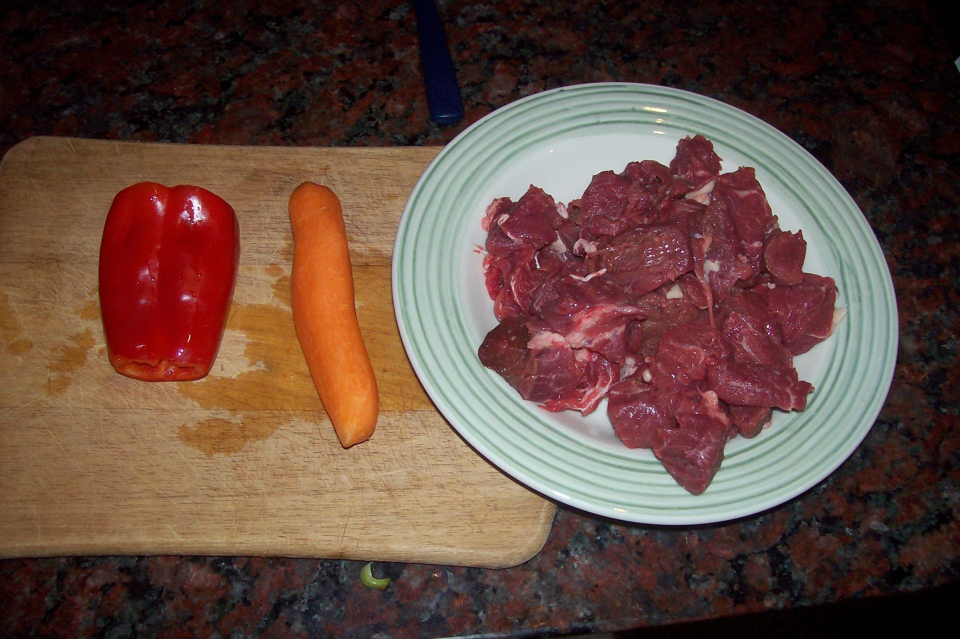 Tomar una sartén, ponerle una cucharada de aceite de oliva y ponerla al fuego. Agregar la cebolla, el morrón y la zanahoria picados y una vez que estén dorados agregar los cubos de lomo y revolver con frecuencia hasta que queden dorados. Luego de revolver unas veces, agregar vino jerez a gusto, a mi me gusta bastante borracho calculale como mínimo un par de medidas.