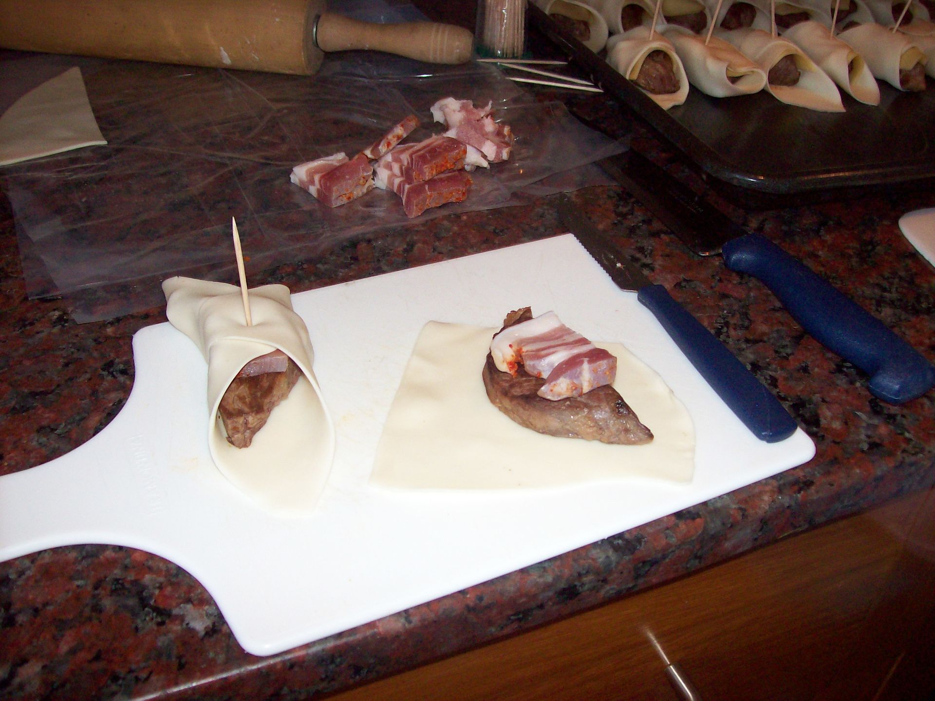 Tomamos la pascualina y le hacemos unos cortes tratando de que los mismos queden en forma de cuadrados (si conseguis una tapa de pascualina cuadrada o de empanadas mejor, yo no conseguí !). Cada parte la ensanchamos un poco con un palo de amasar, ponemos el lomo adentro (si ya están fríos), arriba se le agrega media feta de queso o panceta a gusto, envolves de las dos puntas la masa por sobre el relleno y en donde se juntan las puntas le clavas un escarbadiente.