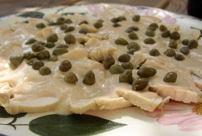 6-Distribuya en una fuente, una capa de rodajas de peceto y cúbralas con una capa de la salsa de atún.