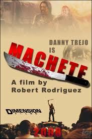 En la primer parte de la película «Planet Terror», aparece una breve presentación de esta idea de Rodríguez, llamada «MACHETE«. Parece bizarra, sangrienta y con personajes poco comunes.