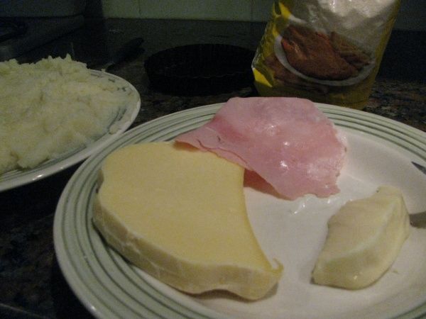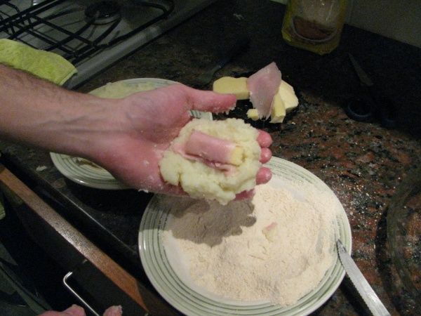 Una vez hecho el puré, pasar a un plato como para que se enfríe un poco y tomar un puñado de puré, en el centro rellenarlo con el queso y el jamón, y taparlo con mas puré. La bola de puré (que seguro te recuerda a cuando en la playa hacías bolas con arena) hay que rebozarla con suficiente pan rallado como para que quede consistente y ponerla en un recipiente en el horno como para que tome temperatura y se dore.
