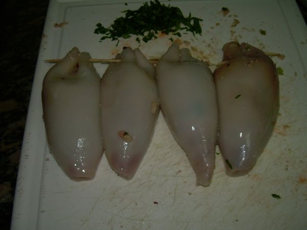 Rellenar con ésta preparación las bolsas de los calamares hasta sus 3/4 partes y sujetar con un palillo.