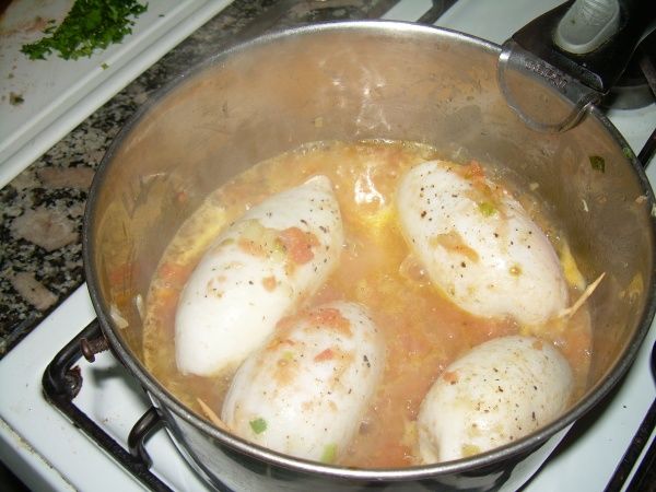 Agregar los calamares rellenos y dejar cocer a fuego mínimo.