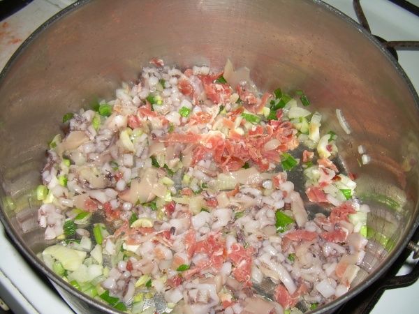Cortar en trocitos pequeños los tentáculos, las aletas y la panceta.