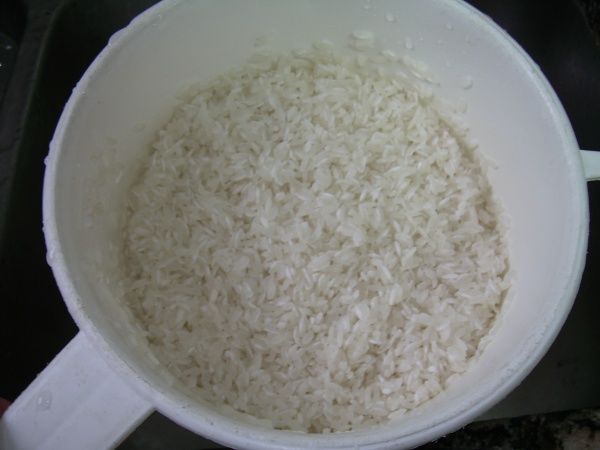 Colocamos el arroz de sushi en la cacerola y lo lavamos con agua frotándolo muy suave para sacarle todo el almidon, yo lo que hice fue colocarlo en un colador grande y abri la canilla de agua fria y con una mano lo revolvía hasta que dejó de salir el almidón.