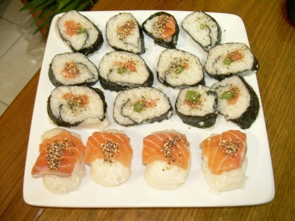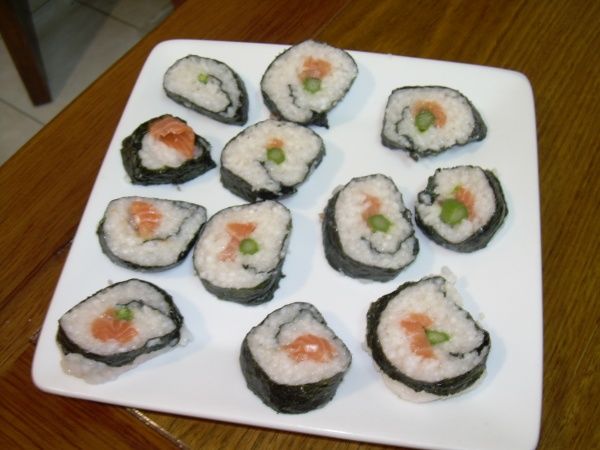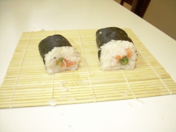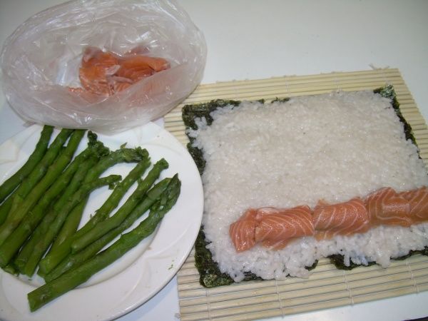 Colocamos un alga sobre la esterilla , sobre el alga ponemos el shari (el arroz aderezado para sushi), dejando libre la parte superior unos 2 cm., sobre el arroz a la largo se coloca el relleno que nos guste, yo puse salmón rosado y espárragos, cada uno que ponga su imaginación en la cocina y lo rellene con lo que mas le guste, puede ser Kani Kama, palta, alcaucil, etc, y luego enrollamos suamente apretando bien con ayuda de la esterilla, por ultimo cortamos en seis cada rollo y servimos.