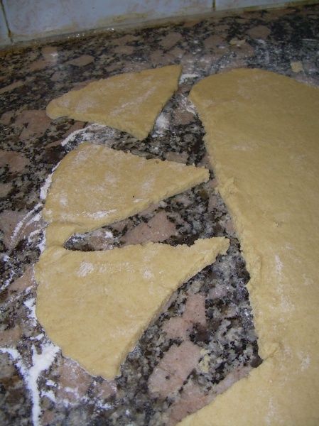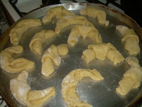 Unir y amasar. Estirar la masa y cortar en triangulos haciendo desde el lado mayor un rollito hacia la punta, luego darle la formita de medialuna.(dejo imágenes)