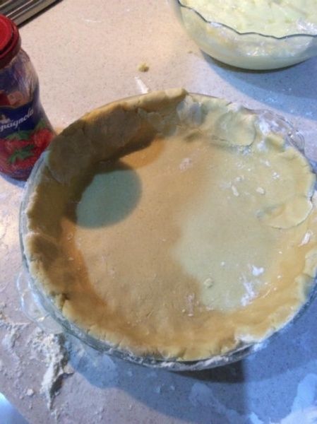 Enmantecar una fuente / tartera de 24 cms., enharinar y cubrir con la masa (ya extendida antes con palo de amasar con harina). Cubrir la base con la masa con un poco de mermelada (sirve de aislante para que no se humedezca la pastelera con la masa).