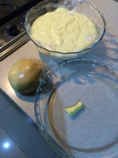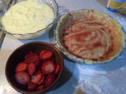 Enmantecar una fuente / tartera de 24 cms., enharinar y cubrir con la masa (ya extendida antes con palo de amasar con harina). Cubrir la base con la masa con un poco de mermelada (sirve de aislante para que no se humedezca la pastelera con la masa).