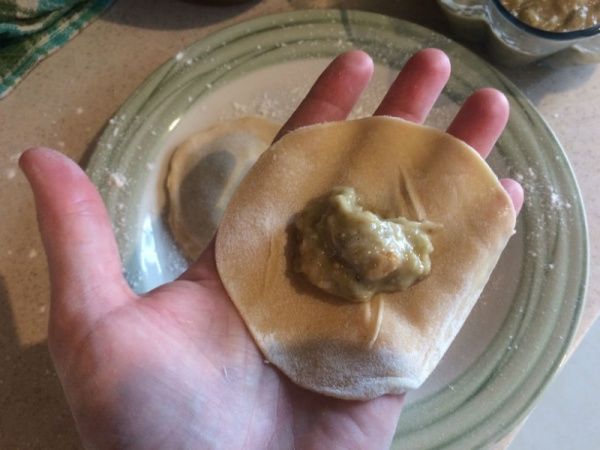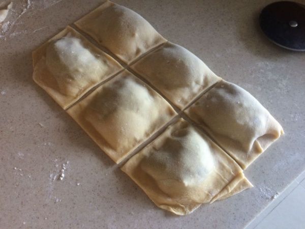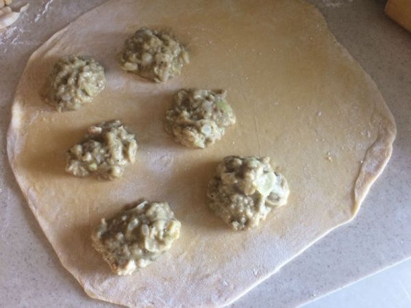 Dividir el bollo en tantas partes como huevos se usaron, y estirar hasta que quede una masa pero que no llegue a ser transparente. Para hacer los sorrentinos se puede usar un molde de plástico o cortar en círculos y luego rellenar, también poner sobre la masa el relleno y plegarla encima, (yo probé esta alternativa pero el relleno al ser líquido se escapa un poco…) importante pegar los bordes con agua (no poner mucha!).