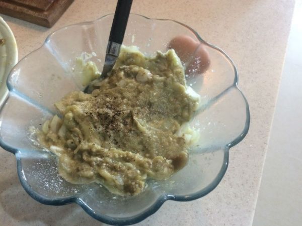 Picar la cebolla y curarla, luego agregarla al bowl. Integrar luego con el queso, el huevo, las nueces y salpimentar. Reservar en la heladera para que se enfríe.
